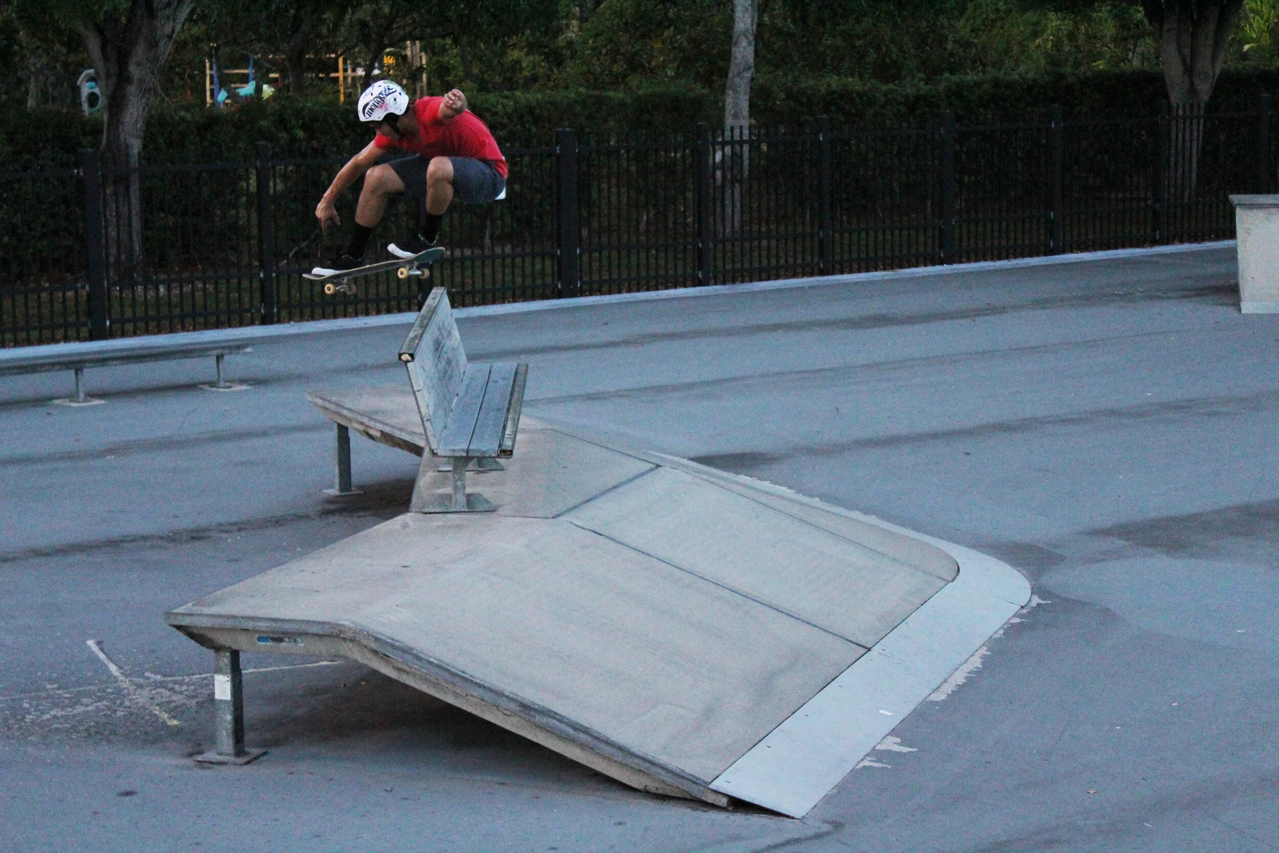 JJ Davila Ollies over the bench at the Perrine Skatepark